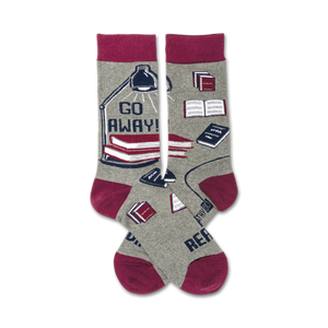 Kick your feet up and let your socks do the talking! Our gray crew socks are stamped with "Go Away! I'm Reading," lit up by a burgundy lamp and a bright white beam shining over a stack of books. Perfect for book lovers who appreciate a good chuckle and the joy of quiet reading time. They're not just socks; they're your next conversation starter—or stopper, if you're deep into your latest page-turner. Ideal for lounging or adding a splash of fun to your daily hustle.