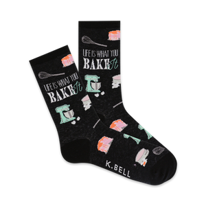 Life Is What You Bake It socks are the perfect gift for any baker, pastry aficionado or pun lover. Show your appreciation for the art of baking with these sweet, delicious socks featuring graphics of baking equipment such as a mixer, whisk, rolling pin, and cake. These 100% cotton crew socks will look fabulous on your feet and be super comfy, whether you're whipping up a batch of cookies, frosting a layer cake, or just daydreaming about your next sugary creation. Available in black with white or gray lettering and graphics.