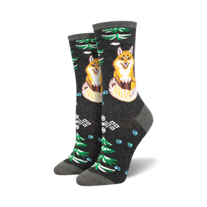 Designed for the discreet adventurer, these dark gray crew socks feature an enchanting tableau of green pine trees, cheery red mushrooms, and a cunning fox nestled in a snowy landscape. It's like having a secret forest party under your trousers! Perfect for those who carry the spirit of the woods in their stride—without having to forage through the underbrush. Ideal for tree huggers, mushroom foragers, and fox admirers alike, these socks are your ticket to a world where style meets the subtlety of nature. Don't just wear them; let them tell your story with every step.