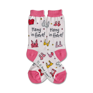 Bras socks: When support becomes fashionable! Support your sisters while keeping your toes warm in these white crew socks with a pink toe, heel, and top. They're adorned with a repeating pattern of bras in various colors and styles, and you'll be sure to get a lift from the words "Hang in there!" written in black on the front. The bottom of each sock carries the encouraging message, "It's all about support." So, whether you're a sports enthusiast or just want to show your support for the girls, these socks are a must-have!