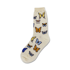 Float like a butterfly and sting like a bee in these crew-length socks for women. With a light cream background featuring various species of butterflies in flight, this sock design is perfect for those who appreciate the simple beauty of nature or want to add a casual pop of color to their wardrobe.