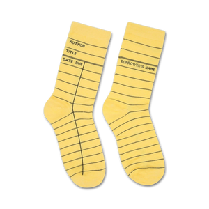Can't find your library card? No problem! Wear a pair of these Library Card Yellow socks and show off your love of literature. Made with a soft, combed cotton blend, these unique socks provide all-day comfort. Featuring bright yellow and black colors, these socks will make you feel like a certified bookworm. Whether you're hitting the books or just lounging around the house, these fun and quirky socks are sure to turn heads.