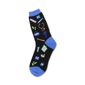 Dive headfirst into the charm of our Nurse novelty socks woven with a collection of vivid medical icons. See the blue H salute you, swallow the playful pills, listen to the stethoscope's heartbeat rhythm, check the thermometer's fever pitch, stir the mortar and pestle's healing potion, eye the prescription bottle's remedy, marvel at the test tube's green vitality, and mend your wounds with the comforting bandages. Show off your medical spirit and resilience with each step!