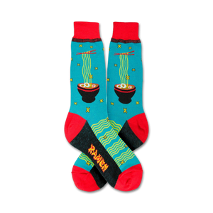 Blue ramen socks for men, featuring a pattern of black bowls filled with yellow noodles, green onions, and a red egg. The socks have a red toe and heel with yellow and green geometric shapes. Show your love for the best comfort food ever, or just show off some fun casual socks.