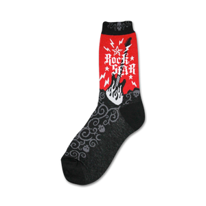 Meet the Rockstar socks! These loud and proud knee-high socks for women are perfect for strutting your stuff on or off the stage. Featuring bold white and yellow lightning bolts, flames, and musical notes over black, these socks will make you feel like a rockstar wherever you go.