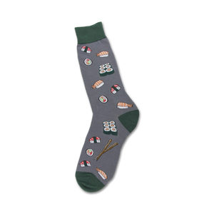 Some of our favorite things are rolled into one with these comfy Sushi socks for men. Featuring a pattern of California rolls, shrimp, and even chopsticks, they're just the thing for those days when you want to " rice " up your outfit. And just like your favorite sushi spot, these socks deliver consistently good style and quality. These gray crew-length socks make a great gift for men who love sushi, seafood, Japanese culture, or just plain fun socks.