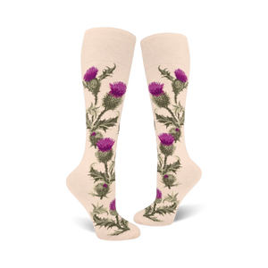 Who wears the pants in your wardrobe? These knee-high socks, of course! Thistle-mania is upon us! With our electric violet thistle pattern on a fresh white background, these socks are sure to liven up any shoe collection. They're perfect for women who want to add a pop of fun and personality to their everyday look. Even the toughest thistle can thrive through any condition. That's the energy you'll get when you step out in our Thistle socks, no matter the weather or the occasion.