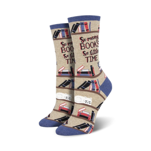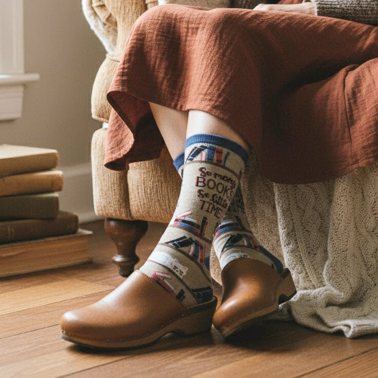 Time For A Good Book socks: Show off your introverted, bookworm side with these knee-high socks showcasing brown bookshelves and sleeping cats. Dive into a new adventure with these comfy socks that are perfect for both book club and cat naps. Purrfect for any literary feline fan!