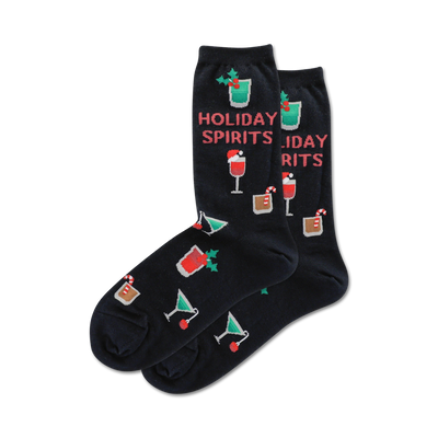 Pair of crew socks in navy blue and heather gray, showcasing a fun holiday cocktail design with red and green accents.