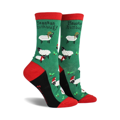 Pair of crew socks; green background with festive sheep wearing Santa hats; red and black accents; 'Baaaa humbug!' text.