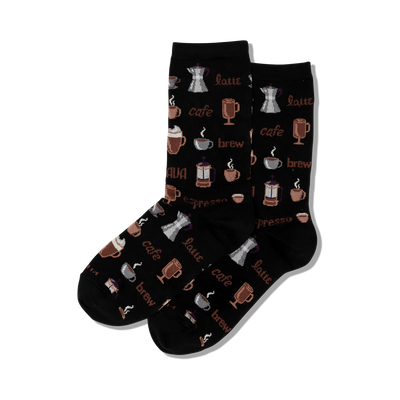 Pair of black crew socks with a whimsical coffee-themed pattern.  Features various coffee drinks and brewing methods in brown and cream.