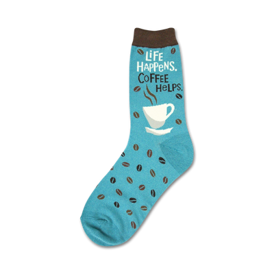 Crew socks with a black background, teal cuffs, and a design of coffee cups and beans.