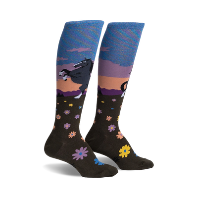 Pair of women's knee-high socks.  Olive green with a sunset scene, a dark horse, and scattered flowers. Blue and purple iridescent top cuff.