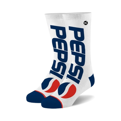 Pair of white crew socks with a navy blue Pepsi logo and red Pepsi globe design.  The socks have navy blue cuffs.