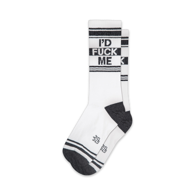 Pair of black and white crew socks with 'I'D FUCK ME' vertically printed. Features black and white stripes.