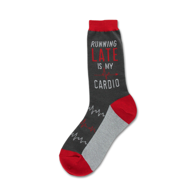 Crew socks in gray and red. The sock features the text 'Running Late Is My Cardio' and a red heartbeat graphic.