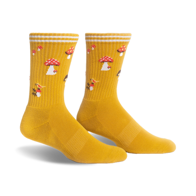 Pair of mustard yellow crew socks with a whimsical mushroom pattern. White stripes accent the cuff.