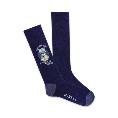 A pair of crew socks in blue with a pattern of cats and bread loaves. The cats are calico and black. The socks have gray cuffs.