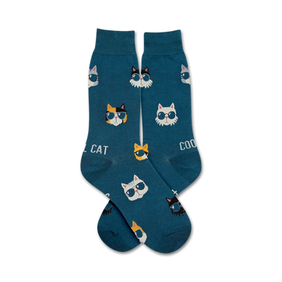 Pair of teal crew socks with a repeating pattern of cats wearing sunglasses.  The cats are white, black, orange, and calico.