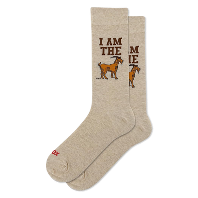 Black crew socks with grey cuffs, heels, and toes, featuring a brown goat head, yellow stars, and "G.O.A.T." text.