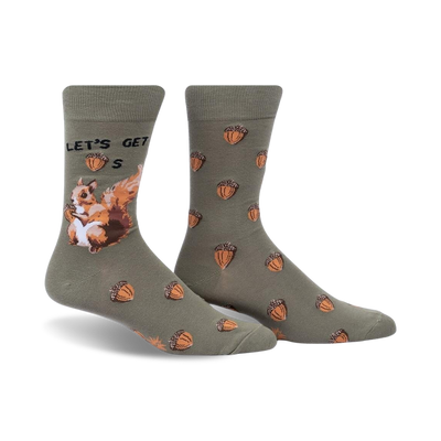 Pair of taupe crew socks featuring a cartoon squirrel holding acorns and the phrase 'Deez Nuts'.  Acorn pattern repeats on the sock.