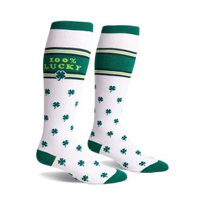For those days you need a bit of good vibes from your feet up, these socks are ready. They’re white with a whole lot of green for good measure, covered in scattered four-leaf clovers. Up top, there's a bold green stripe with '100% LUCKY' printed in a lighter green, along with more thin green stripes. The toe and heel are also a solid green, giving them a nice pop. Slip these on and feel that extra bit of everyday fortune.