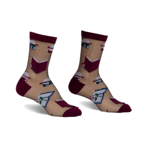 Got a head full of stories? We've got socks for that. These sheer socks bring a clever twist to your everyday look, featuring a unique pattern of open books with deep red covers and crisp white pages. Some of the visible books even have delicate pink roses blooming from their pages, adding a touch of romance. Scattered around are smaller illustrations that look like vintage reading lamps, or perhaps little people enjoying a good read, all set on a light, translucent background. The cuffs, heels, and toes come in a rich burgundy, framing the 'novel idea' of this design perfectly. They're a subtle nod to your literary side, ready for whatever adventure your day holds.