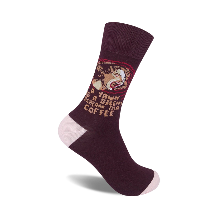 Unleash your inner barista with our 'A Yawn Is A Silent Scream' socks! Slip into these dark purple, crew-length socks with light purple toe and heel and proudly display your love for coffee. Featuring the hilarious saying "A yawn is a silent scream for coffee," these comfy socks will fuel your caffeine cravings and brighten up your day. Perfect for those early mornings or post-lunch slumps, they'll remind you that a cuppa joe is just a sip away. Show off your passion for coffee and add a touch of humor to your sock game.