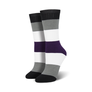 You'll be the ace of the party with these colorful socks featuring four stripes in black, grey, purple, and white. Perfect for showing off your pride in style whether you're hanging out with friends or just kicking back at home, these crew length socks are sure to turn heads and make you smile. Plus, they're suitable for both men and women, so everyone can get in on the fun.