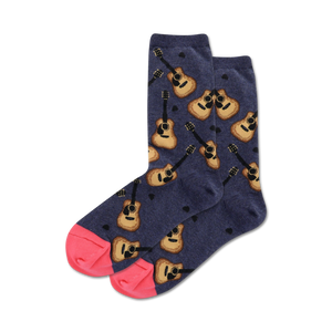 These Acoustic Guitars socks are the perfect accessory for any aspiring rockstar. With a dark blue background and a pattern of brown acoustic guitars with pink strings, these socks are sure to make a statement. Plus, the pink toes and heels add a touch of fun and femininity. Wear these crew socks with your favorite sneakers or boots, and you'll be ready to take on the world. Fun fact: Did you know that guitars are one of the most popular instruments in the world? It's true! So, whether you're a seasoned musician or just a casual fan, these socks are the perfect way to show your love for all things music.