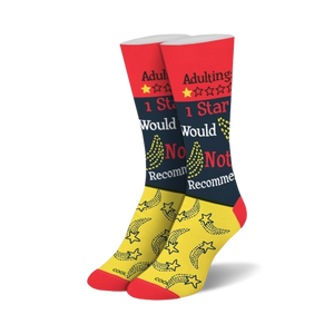 Wrap your ankles in a bold declaration of rebellion against the humdrum of adulthood! These red and black crew socks, speckled with defiant yellow stars, sport the ultimate cheeky review: "Adulting: 1 Star, Would Not Recommend". Perfect for those days when you're not here for adult responsibilities and your feet speak your mood.