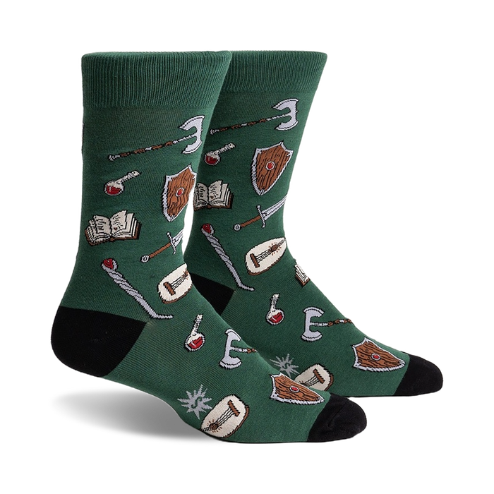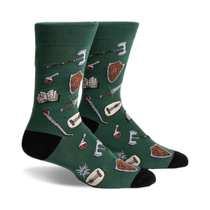 Don your questing attire from the ground up with these epic crew-length socks, emblazoned with the legendary gear of adventurers and lorekeepers. Whether you're rolling the dice in a daring campaign, brandishing foam swords in a grand LARP, or simply questing through the daily grind, these socks weave a tale of books for the scholars, swords and axes for the warriors, shields for the defenders, and potions for the alchemists. A perfect fit for the feet of any tabletop conqueror or realm roamer.