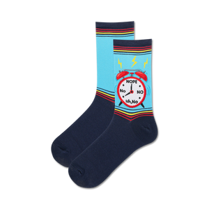 Shout a resounding “Nope!” to the morning alarm with these sassy blue crew socks. Adorned with ringing alarm clocks, complete with red bells and urgent yellow lightning bolts, these socks tell the world you're not having it today. The hands of each clock defiantly point to your mood manifesto: “No,” “Nope,” “Uh Uh.” Slip into these and let your feet do the talking when the early hours are calling.