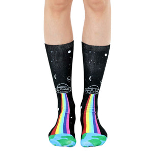 Abduction: Black socks with an all-over pattern of stars and planets. On the front of each sock is a spaceship that shoots a rainbow down to Earth. Earth is on the bottom of the socks. Wear this intergalactic pattern and you just might get abducted by aliens.