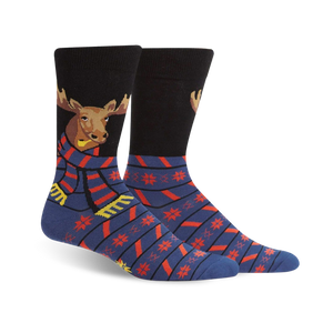 Swing into action with our All Bundled Up moose crew socks! These kicks combine cozy style with a festive punch thanks to their fun pattern of red and orange snowflakes dancing across a bright blue backdrop. But the star of the show is the adorable cartoon moose rocking a red and white striped scarf on the black top. Representing resilience in the face of winter's chill, these socks are perfect for keeping your feet warm and your spirits high during the holiday season.