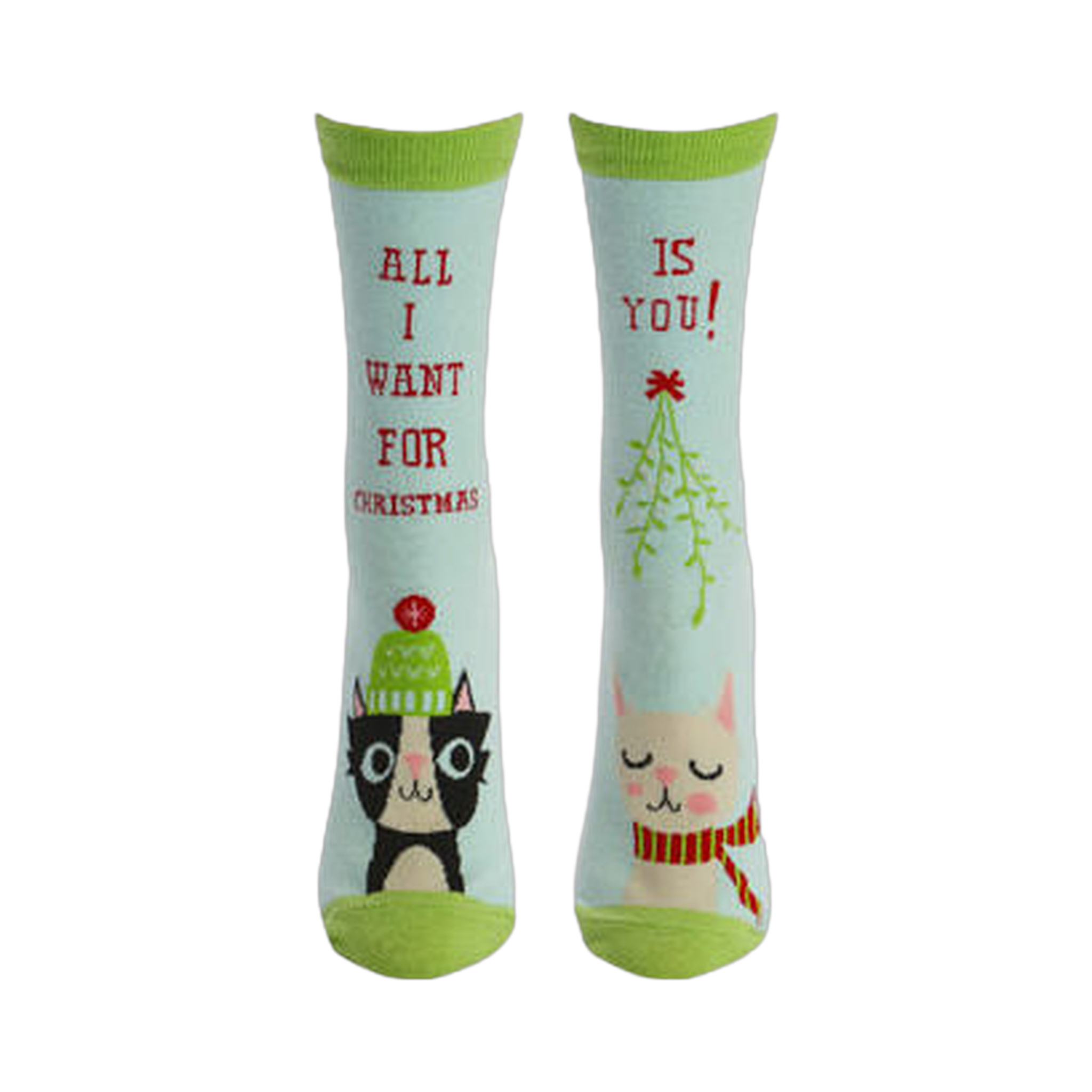 Who's that purring under the mistletoe? These super cute light blue and lime green socks will tickle your Christmas spirit with adorable cats! Each fun sock features a different cat dressed for the chilly weather outdoors. The lyrics "All I want for Christmas is you!" is broken up between the pair to complete the purrfect look.