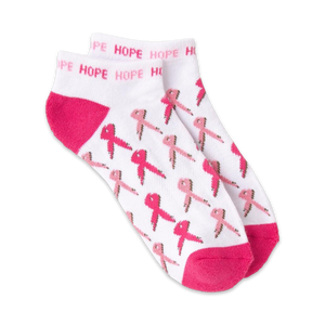 Ribbons of hope, wrapped around your feet in delicate pink. Slip into these ankle socks and let the positivity flow through you. The word "hope" is playfully scattered throughout the design, like a gentle reminder that even the smallest flicker of optimism can make a world of difference.