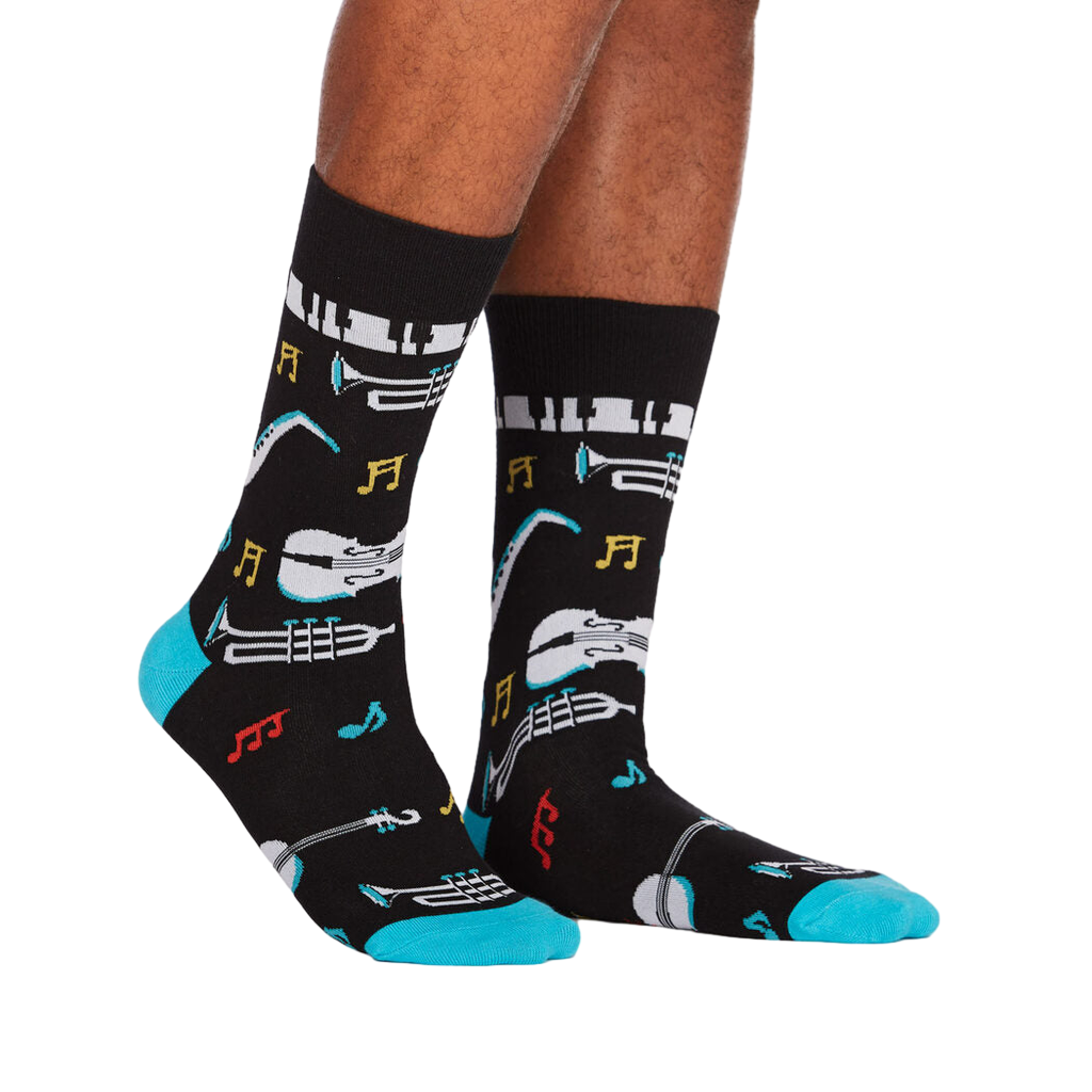All That Jazz men’s crew socks bring a full bandstand of personality to an everyday essential. With saxophones, trumpets, trombones, musical notes, and a piano-key cuff, these socks feel lively without trying too hard. The pattern has just enough rhythm to catch the eye, but it still works with the kind of outfits that need a quiet hit of character.
