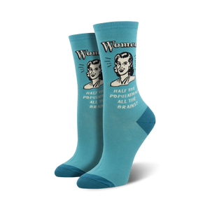 These aren't just socks, they're a statement! Show off your girl power with these electric blue crew socks that proclaim "Women...Half the population, all the brains!". Perfect for the witty feminist who's not afraid to stand up for her smarts. Let your feet do the talking and leave no doubt that women are the brains behind the operation. Grab a pair today!