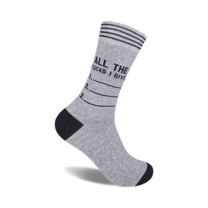 Get ready to elevate your sock game with All The Fucks I Give socks! Forget about boring old socks - these sassy crew socks are all about fun and expressing yourself. With their bold black text against a sleek gray background and three empty lines below, it's like you're making a list of all the cares you don't have. Show off your carefree attitude and let your feet do the talking. Whether you're a man or a woman, these unisex socks are perfect for anyone who loves to have a little cheeky fun.