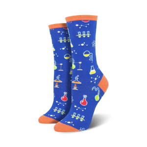 Calling all brainiacs, chemistry lovers, and those with a touch of scientific flair! Our "All the Solutions" socks are here to brighten up your day one test tube at a time. With a vibrant pattern of orange test tubes, beakers, molecules, and flames dancing across a sea of blue, these socks are a fun and geeky way to show off your inner scientist. Perfect for the lab, the classroom, or just a casual day out, these socks are sure to bring a smile to your face and spark conversations wherever you go. Get ready to solve the mysteries of style and comfort with "All the Solutions" socks!
