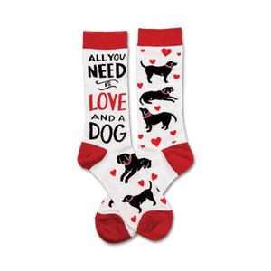 Dogs! Love! Socks that make you dance! These white, red-toed, red-and-black-doggie-and-red-hearts-themed "All You Need Is Love And A Dog" Crew Socks have the feel-good power to make you and any dog-lover jump for joy with every wear. Their comfy (and, yes, cute!) red-cuffed, cushioned goodness will have you barking "Yip, Yip! Fetch me another pair!"
