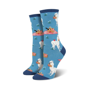 There's nothing cuter than an alpaca who will pack a lunch for you! These cool, funny socks would make the perfect gift for any alpaca lover. Each adorable pair of women's crew features white alpacas and picnic baskets printed all over on a pleasant blue background. Life is a picnic, especially when you've got some fluffy, cute alpacas to keep you company.