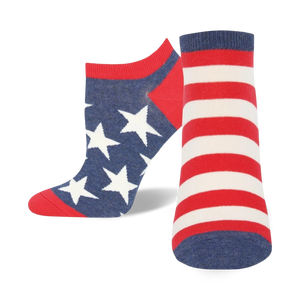 Walk around on cloud nine in these American flag ankle socks! They will have you saying "bombs bursting in air" with every step you take in these patriotic, star-spangled ankle socks. Kick back and put your feet up with our soft, thick American flag socks, made for women with comfort and fun in mind. Great for Memorial Day, Fourth of July or just a cool summer day.