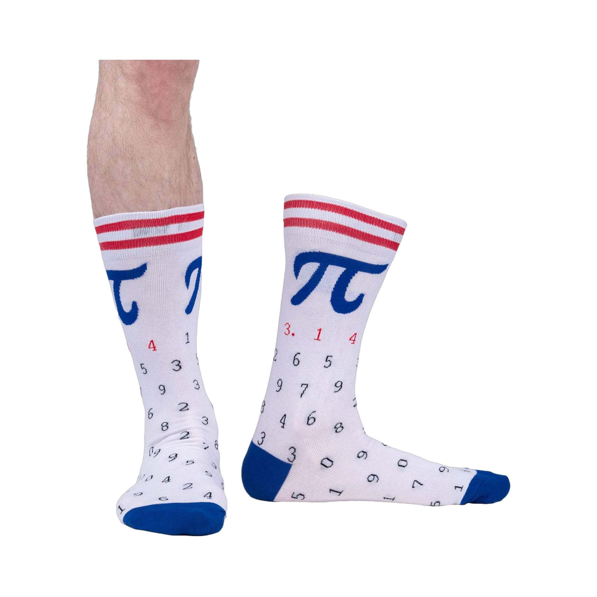 These 'American Pi' socks are a fun twist on a classic. The main color is white, with a bold blue and red color scheme. A large, stylized Pi symbol is shown near the top of each sock, surrounded by digits of Pi itself. The visible portion features a repeating pattern of numbers- it's a cool detail. They're crew socks, with a blue cuff at the bottom and thin red and white stripes at the top.