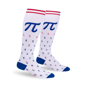 These 'American Pi' knee-high socks are a fun twist on classic style. They're mainly white with a blue and red color scheme. The visible design features the mathematical constant Pi, displayed both as a symbol and a sequence of digits. The digits are scattered across the sock in a grid pattern. A red and white stripe is visible at the top of the sock. The toes are a solid blue, making these a quirky and comfy choice for math enthusiasts or anyone who appreciates a touch of whimsy.