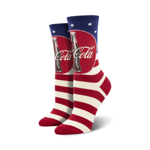 These sock-a-cola socks are bursting with American pride! The red and white stripes, blue circle with a black Coca-Cola bottle, and six white stars will have you shouting "Stars and Stripes Forever!" They're as refreshing as an ice-cold Coke on a hot summer day. Put these on to support your favorite soda or just to show off your patriotic spirit.