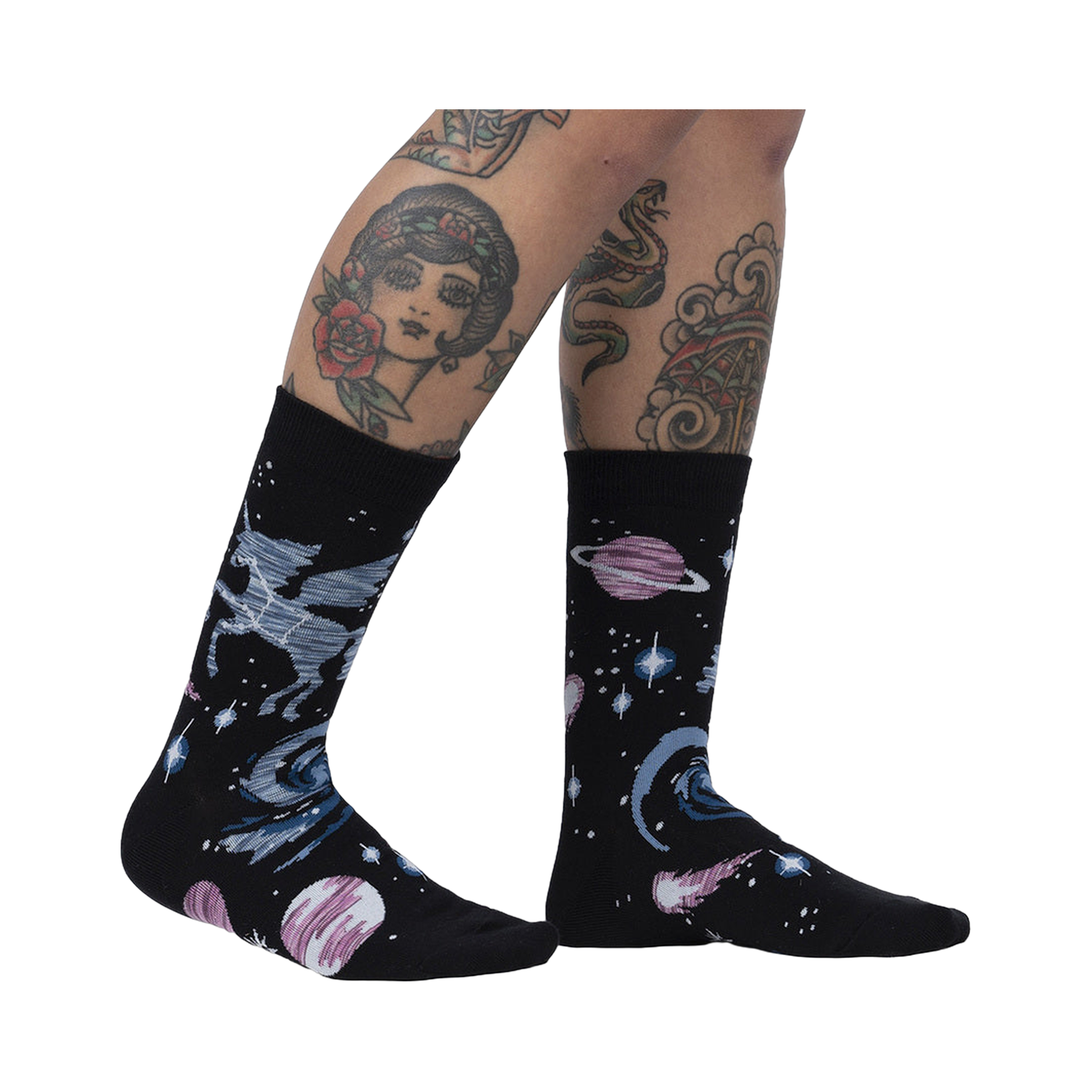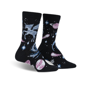 Introducing our celestial chic crew socks, where your feet take flight on a cosmic journey! These aren't just any old socks—they're a constellation of style, featuring a playful parade of Pegasus, twinkling stars, distant planets, and zipping comets against a sleek black backdrop. Slip into these socks and let your imagination soar beyond the stratosphere. Whether you're stargazing from the comfort of your couch or strutting your stuff on the streets, these socks are sure to add a touch of intergalactic charm to any ensemble. So, why settle for ordinary when you can elevate your sock game to astronomical heights?