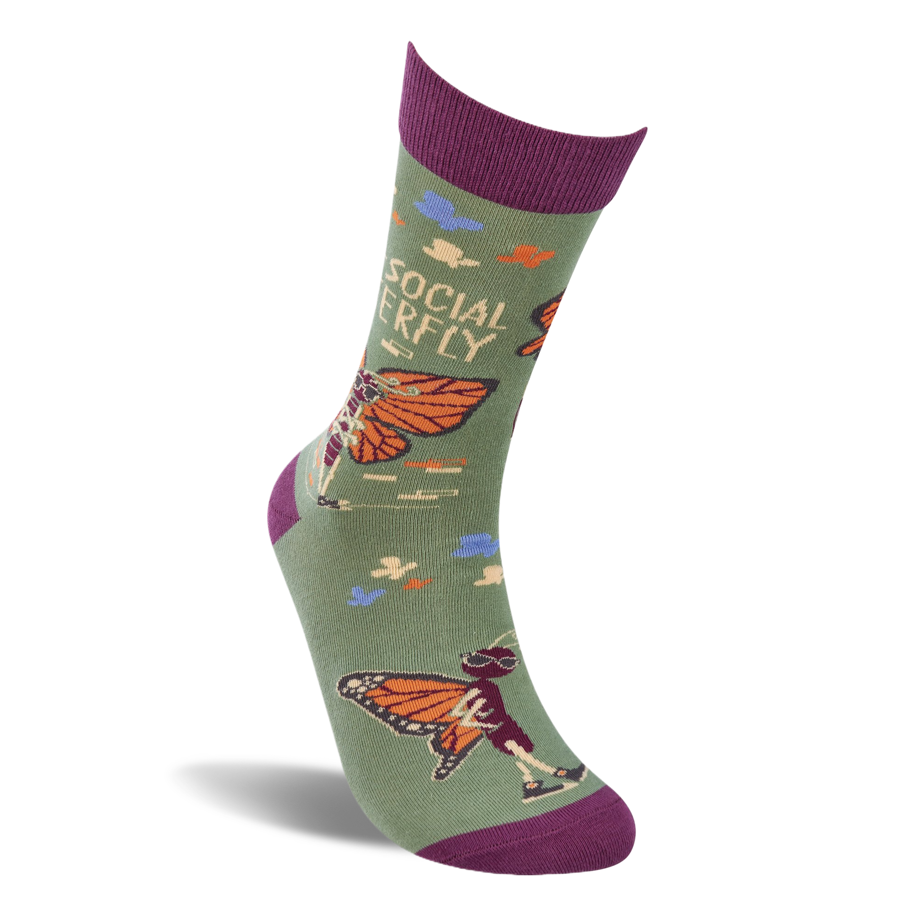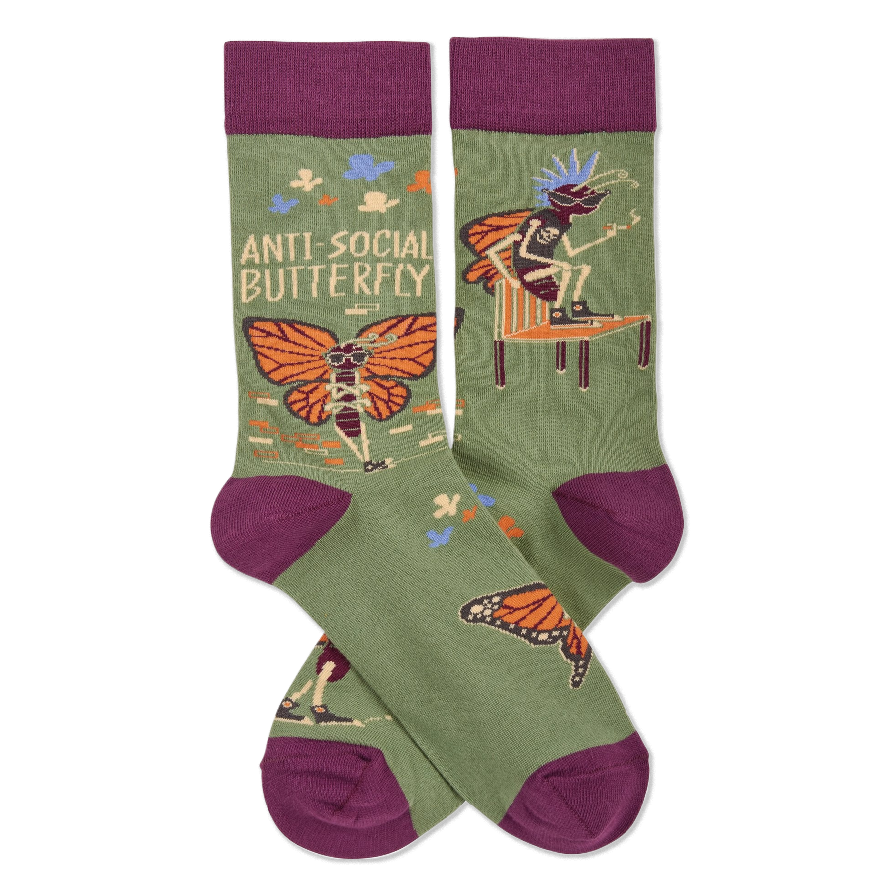 Rock your solitude with these olive green crew socks. One sock features the text "ANTI SOCIAL BUTTERFLY" above a large, orange-winged monarch character wearing cool sunglasses. The other sock shows a similar skeleton butterfly, but this one's relaxing on a chair, sporting a spiky blue mohawk, and puffing on what looks like a cigarette. Both socks feature smaller, matching skeleton butterfly designs visible across the fabric. Dark purple accents on the cuffs, heels, and toes complete the look. They're ideal when you just want to chill and watch the world go by.