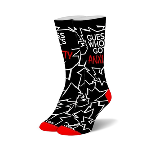 If you're looking for a sock that's as electrifying as your energy, then look no further! Our Anxiety socks are sure to make a statement. With their bold white and red lightning bolt design, these socks are the perfect way to add a touch of personality to any outfit. Plus, the large white "Guess Who's Got Anxiety?" lettering on the side of each sock is sure to get a chuckle from anyone who sees them. Whether you're rocking them at the gym, at work, or just lounging around the house, these socks are sure to keep you feeling comfortable and stylish.